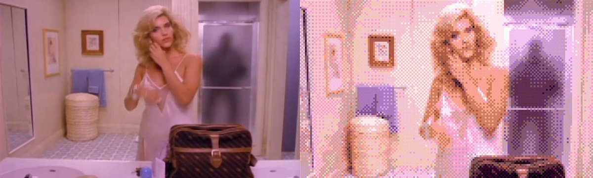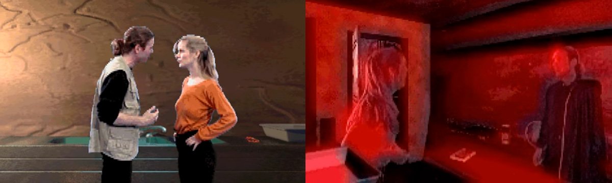 Videotiedostojen kokoa typistettiin raa’asti skaalaamalla resoluutiota alas, vähentämällä kuvatiheyttä, kompressoimalla ääntä tai esittämällä se MIDI-muodossa, toistamalla kuvaa rajoitetulla väripaletilla, pienentämällä videokuvan kokoa ruudulla tai toistamalla vain joka toinen rivi pikseleitä. Yllä kuvaa Night Trapista (1992), vasemmalla täyskuvana ja oikealla SEGA CD:lle kompressoituna