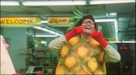 Yhtä lailla voi olla vaikeaa kuvitella yksipuolisen kuvan näyttelijän urasta saaneen katsojan silmin erästä Tiger on the Beat -elokuvan (1988) kohtausta. Maailman hienoimmista kungfu-elokuvista vastanneen Lau-Kar Leungin buddy-cop-leffassa uljas sankarimme CYF nauttii krapulassa katsojan silmien edessä 12 raakaa kananmunaa kertoen katsojalle saaneensa krapulareseptin Alain Delonilta, Sylvester Stallonelta ja Ti Lungilta (?) ja kusee sen jälkeen ulisten housuihinsa joutuessaan roiston aseen piipun eteen. Millaisen erinomaisen itseironisen pokan tämä vaatii, kun ottaa huomioon, että kahtena aiempana vuonna on julkaistu miehen supersuosioon laukaisseet Better Tomorrow I ja II, jossa sankarit eivät kastele pöksyjään vaikka heistä tehtäisiin peckinpahilaista reikäjuustoa? Entä Fractured Follies, jossa Chow näyttelee äkillisesti kilpailutilanteeseen joutuvan sekatavarakaupan työntekijää (kts. edellinen artikkeli ja Chicken and Duck Talk), joka joutuu markkinatalouden luoman kilpailutilanteen puristuksessa turvautumaan mitä epätoivoisempiin keinoihin, kuten pukeutumaan jättimäiseksi ananakseksi?